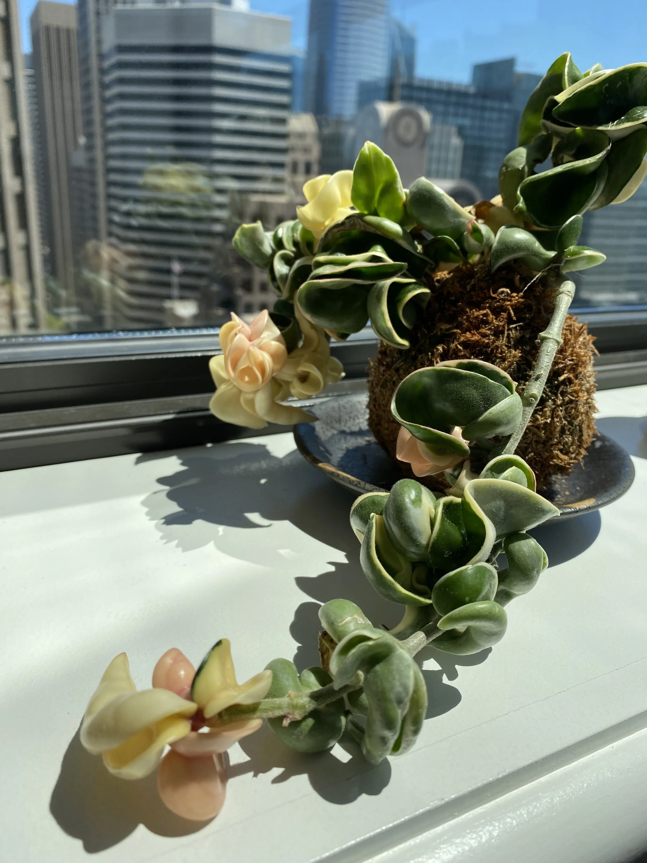 This one is definitely my favorite with its green, white, and pink colors. She’s a beautiful hoya succulent and super easy to take care of. The ball of moss she sits in helps retain water longer and she gets a good soak once a week.
