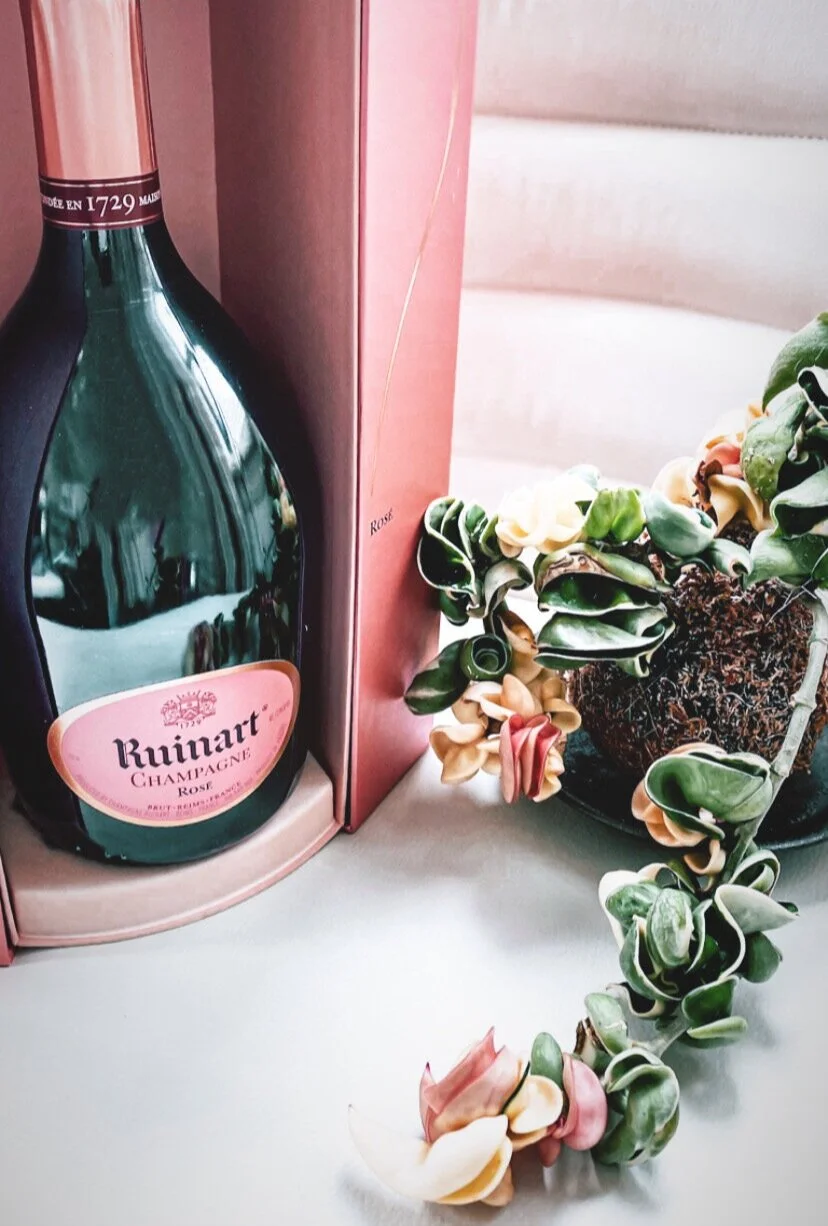 Ruinart Champagne Rose and pink and white variegated hoya succulent.